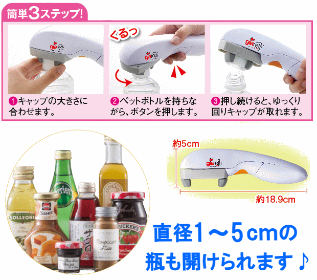 ●開封可能瓶/丸型 外径:10〜50mm ●生産国:中国(日本のメーカーの企画・品質管理で製造) ●他の瓶開けアイテムはこちらから人気上昇中!自動ペットボトルオープナー TV番組で紹介されました! ■女性や、お年寄りやお子様には固すぎるペットボトルのふた。