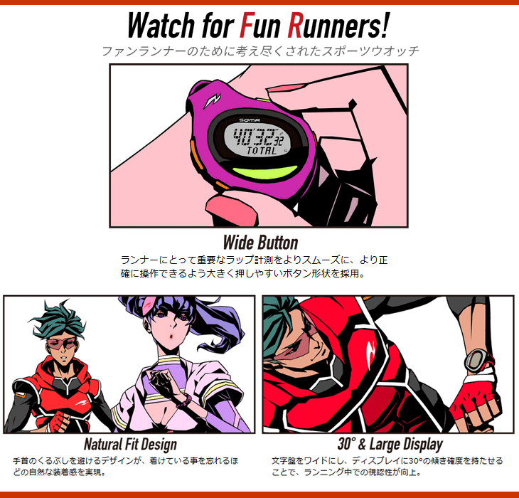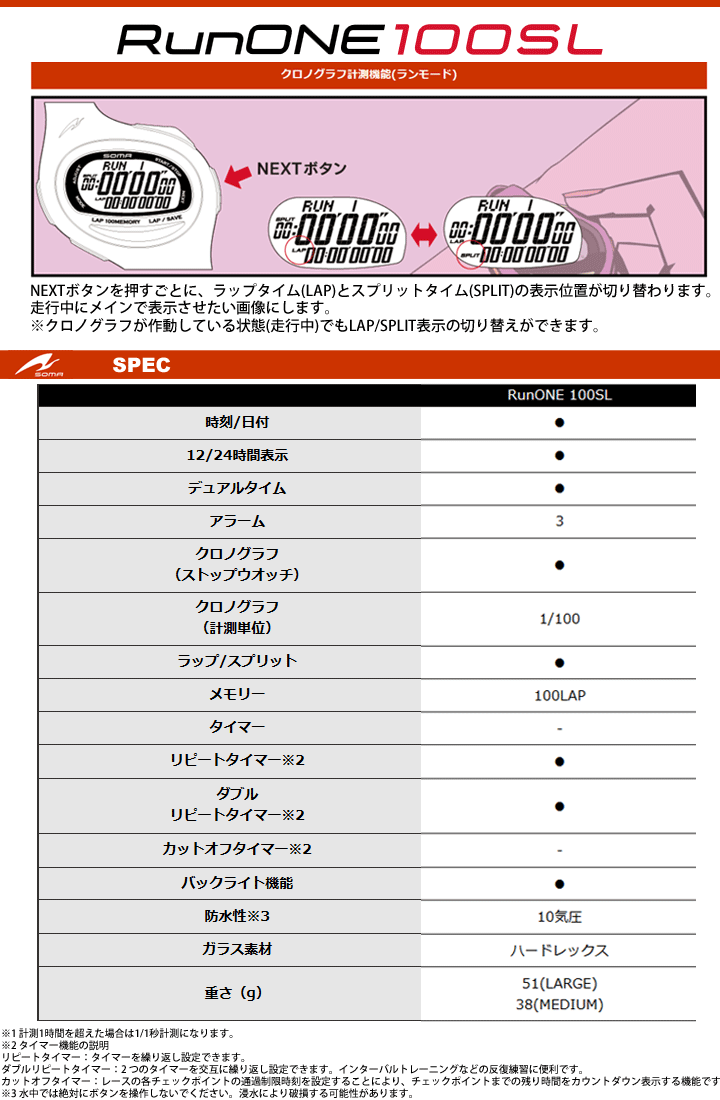作動温度範囲 -5℃〜+50℃ 仕様・機能 ■プラスチックケース(裏蓋:ステンレススチール) ■ハードレックス ■ウレタンバンド(ステンレススチール美錠) ■ランモード:100LAPメモリー ■データモード ■タイマーモード ■アラームモード ■バックライト機能 電池 リチウム電池:CR2025 ※メーカー希望小売価格はメーカーサイトに基づいて掲載しています (記載価格が税抜き価格になっている場合もございます)【SOMA ソーマ Run ONE 100SL】 ◆ 商 品 説 明 ◆ スポーツをより楽しむことをコンセプトとしたスポーツウォッチブランド【SOMA(ソーマ)】 見やすさ・操作性・フィット感などランナーのニーズに応えた性能に加え、 手首のくるぶしを避けるデザインや、ケースとストラップの一体感を作り出すシームレス構造を採用。