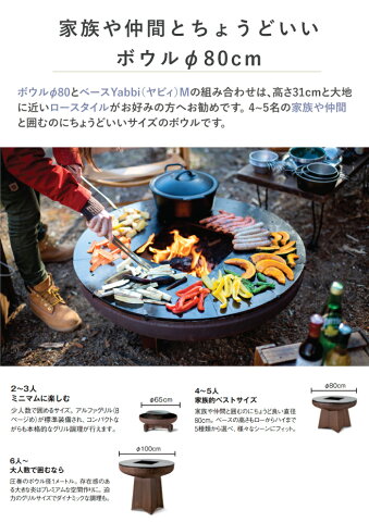 メーカーYAGOONA(ヤグーナ)社製 発売元FIRESIDE(ファイヤーサイド)サイズ直径80×H31cm 重量:47.8kg(ボウルφ80/45.0kg、Yabbi M/2.8kg)材質鉄(グリル8mm/ボウル・ベース3mm)生産国オーストリア製特徴グリルを備えた屋外専用の焚き火台 4つに分割されたグリルはお手入れや収納に実用的で、厚み8ミリの高い蓄熱性をもたらす鉄板で本格的な鉄板料理が楽しめる。