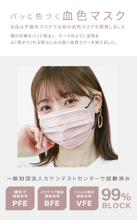 平紐で耳が痛くなりにくく、華やかなカラーで顔色がぱっと明るくみえる、おしゃれな血色マスクです。